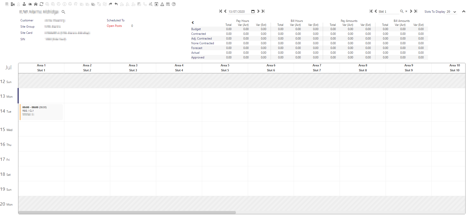 Finally, the Site View grid takes on a new look for version 20.2. The Areas, Posts and Slots are shown across the top of the grid (see clip below). These are fully configurable within the Web Client - you are able to rename them to more user friendly names for your business, instead of the defaults. The days of the weeks are shown down the rows of the grid. New, fresher looking duties are displayed in the matrix. The duties, when selected can be actioned using the context sensitive tool bars or right-hand mouse button menu options. Additionally, drag and drop functionality is used for tasks such as moving duties.