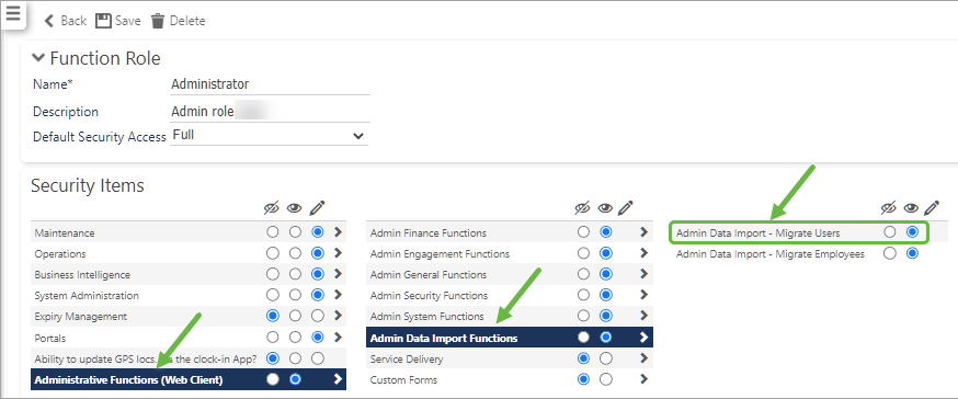 Use the following steps to add the Admin Data Import - Migrate Users access to your admin role.